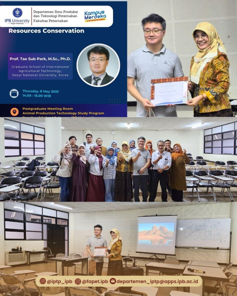 Bogor, 8 Mei 2025 — Departemen Ilmu Produksi dan Teknologi Peternakan (IPTP), Fakultas Peternakan IPB University, kembali menggelar kegiatan guest lecture berskala internasional sebagai bagian dari upaya peningkatan atmosfer akademik dan kolaborasi global. Pada kesempatan kali ini, Departemen IPTP menghadirkan narasumber dari Graduate School of International Agricultural Technology, Seoul National University (SNU), Korea Selatan, dalam kuliah tamu yang bertajuk: