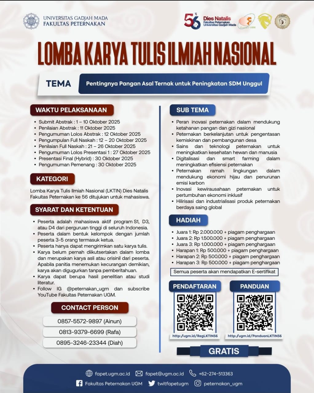 Lomba Karya Tulis Ilmiah Nasional (LKTIN) Dies Natalis ke-56 Fakultas Peternakan UGM resmi dibuka!