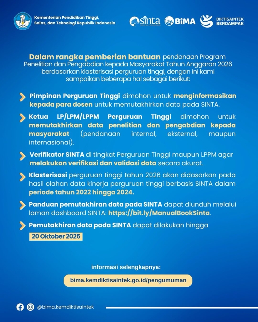 Demi mendukung akurasi data kelembagaan dan proses kebijakan penelitian, semua dosen, peneliti, dan tenaga kependidikan DIPTP diminta segera memutakhirkan profil dan publikasi di SINTA (https://sinta.kemdikbud.go.id). Batas akhir: 20 Oktober 2025.