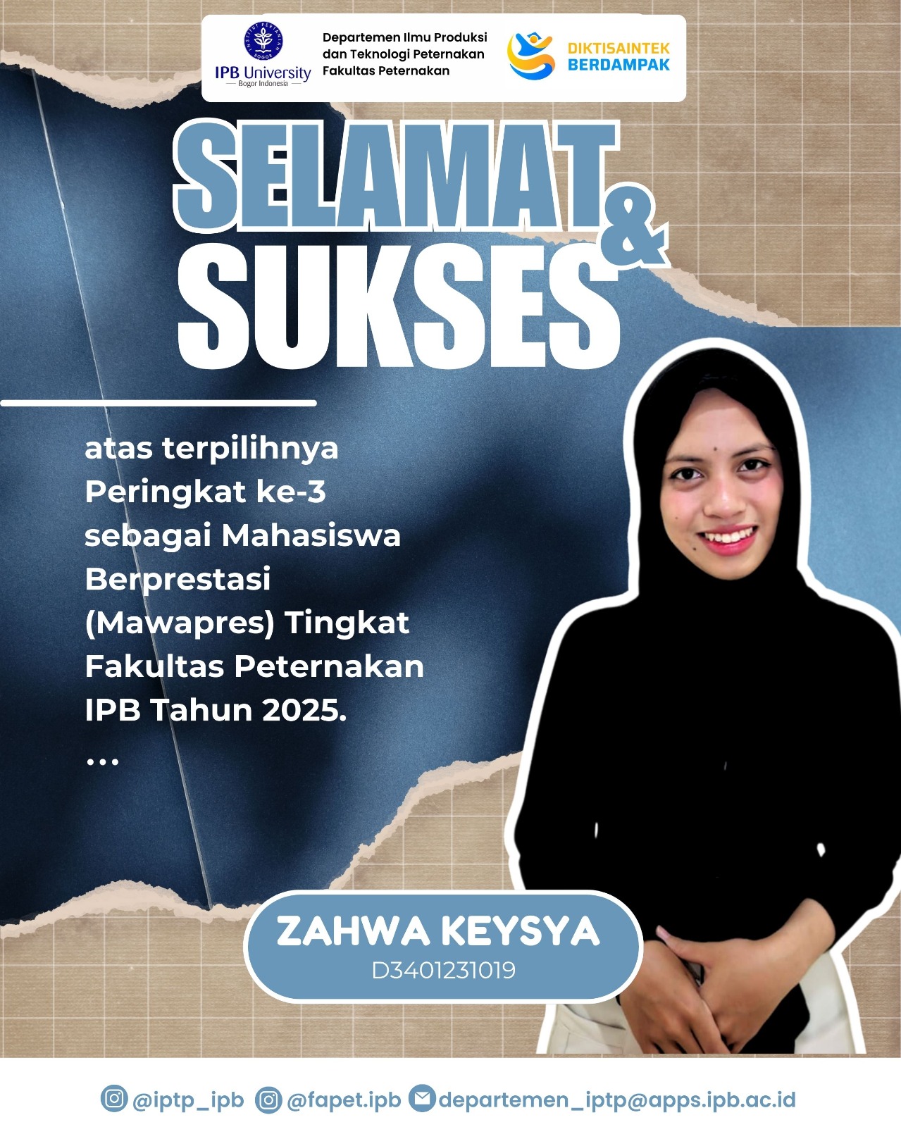 Selain itu, Zahwa Keisya, mahasiswa IPTP lainnya, juga mencatatkan prestasi membanggakan dengan meraih Juara 3 Mahasiswa Berprestasi Fakultas Peternakan IPB 2025, di bawah bimbingan Prof. Epi Taufik sebagai dosen penggerak. Keberhasilan ini menegaskan kualitas pembinaan prestasi mahasiswa yang berkelanjutan di lingkungan IPTP.
