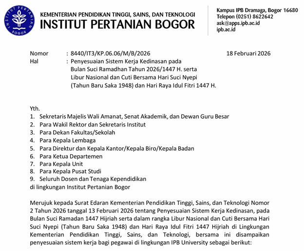 Penyesuaian Sistem Kerja Kedinasan padaBulan Suci Ramadhan Tahun 2026/1447 H. sertaLibur Nasional dan Cuti Bersama Hari Suci Nyepi(Tahun Baru Saka 1948) dan Hari Raya Idul Fitri 1447 H.