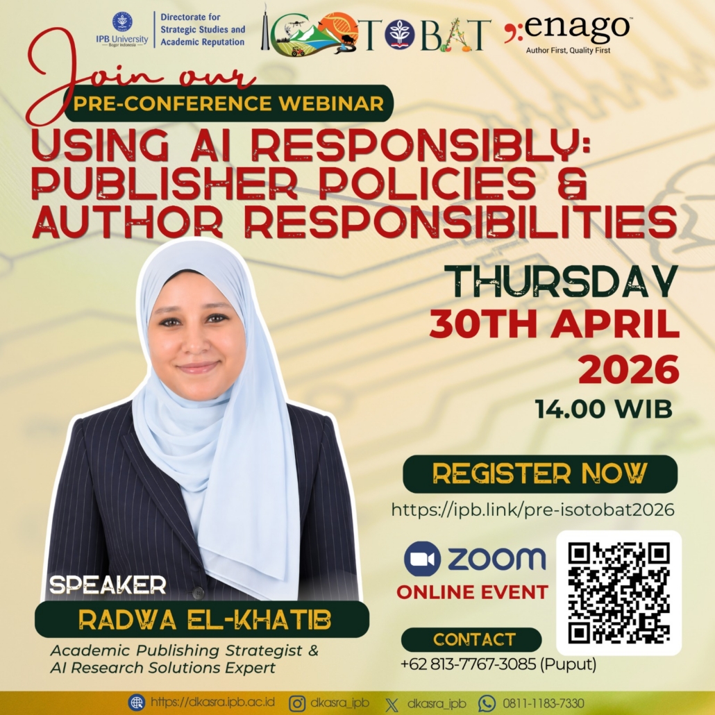 To strengthen IPB University’s commitment to improving the quantity and quality of international scientific publications, DKSRA and enago proudly present the “ISOTOBAT 2026 Pre-Conference Webinar, Using AI Responsibly: Publisher policies & author responsibilities.”